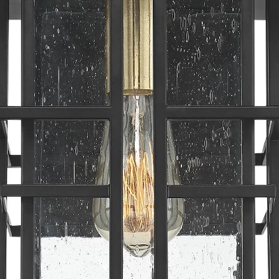 Enhance the curb appeal of any outdoor design with this set of two modern outdoor wall lights. From the Possini Euro Design® brand, the lights feature a simplified geometric frame in a black finish complements the seedy glass over a single bulb. The bulb socket features a burnished brass finish for that pop of unexpected metallic color.