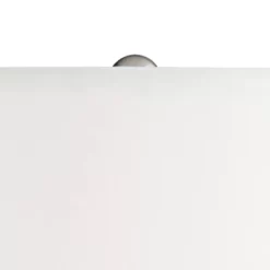 - Blue and gray finishes over handcrafted art glass body. Brushed nickel finish accents. Please note – slight variations in color and pattern may occur. White drum shade. 8-foot long cord.