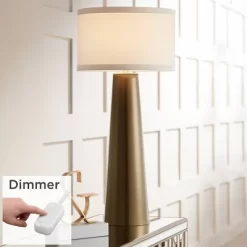 Add elegant beauty to your home with this illuminating dark gold table lamp. Constructed in glass, the tall design features an understated and minimalist tapered column profile. This lamp comes with a tabletop dimmer, which allows you to control the level of lighting. Simply insert the lamp plug into the dimmer outlet, and then slide the switch on the control to dim or brighten the lighting.