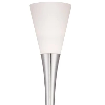 Brighten a contemporary or modern living space with the chic style of this metal torchiere floor lamp from the Possini Euro Design® brand. The look is smooth and alluring with subtle curves and a sleek brushed nickel finish. On top, a white glass shade flares upward, balancing the tapered base below and completing the look.