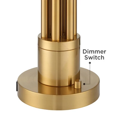 From Possini Euro Design®, this exceptional metal table lamp displays a warm antique brass finish that brings an inviting presence. It also features a frosted glass shade and dual USB ports for charging smart phones and other electronics. Evoking an elevated industrial motif, the lamp features a round base and six-piece metal tube body. A handy dimmer completes this exceptional desk lamp design.