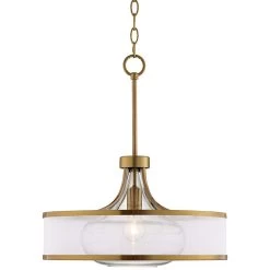 - Warm antique brass finish base and accents. Metal construction. Frosted white glass dome bowl shade. 8-foot long clear silver cord.